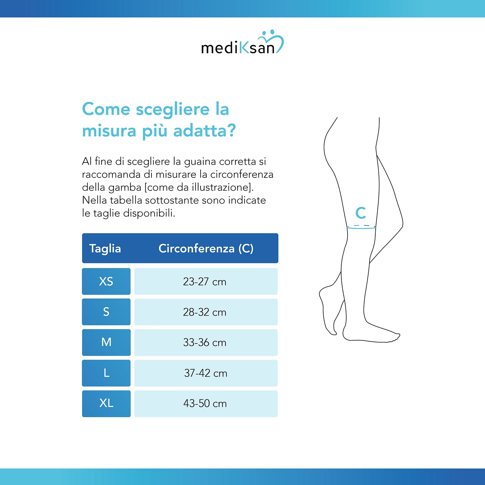 Misura la circonferenza facendo passare il metro intorno alla gamba nel punto indicato nell'illustrazione a destra, poi confronta il tuo valore con la tabella misure qui sotto per scegliere la taglia adatta a te.